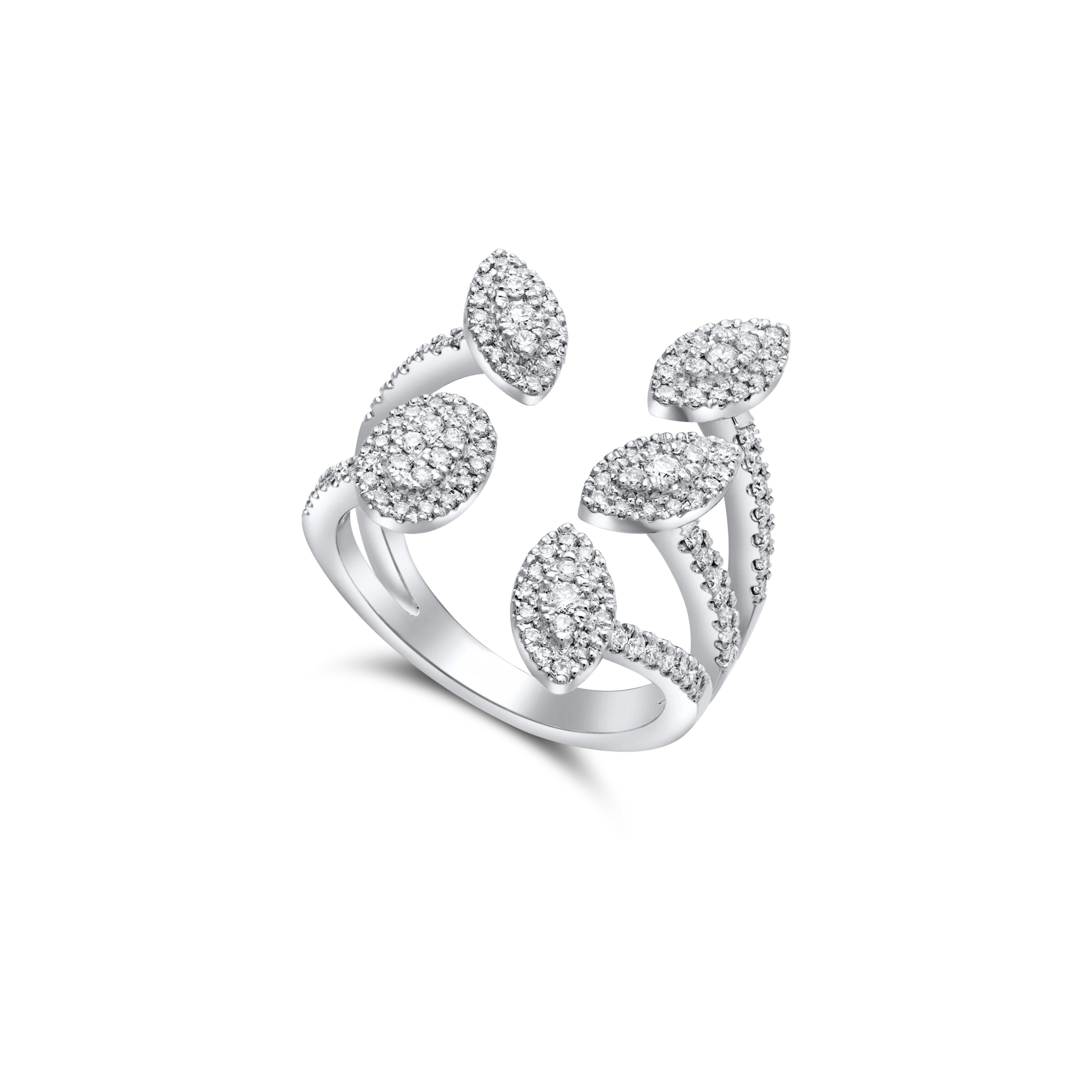 18K White gold open ring with five diamond units facing assymetricly in marquise and oval shapes