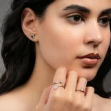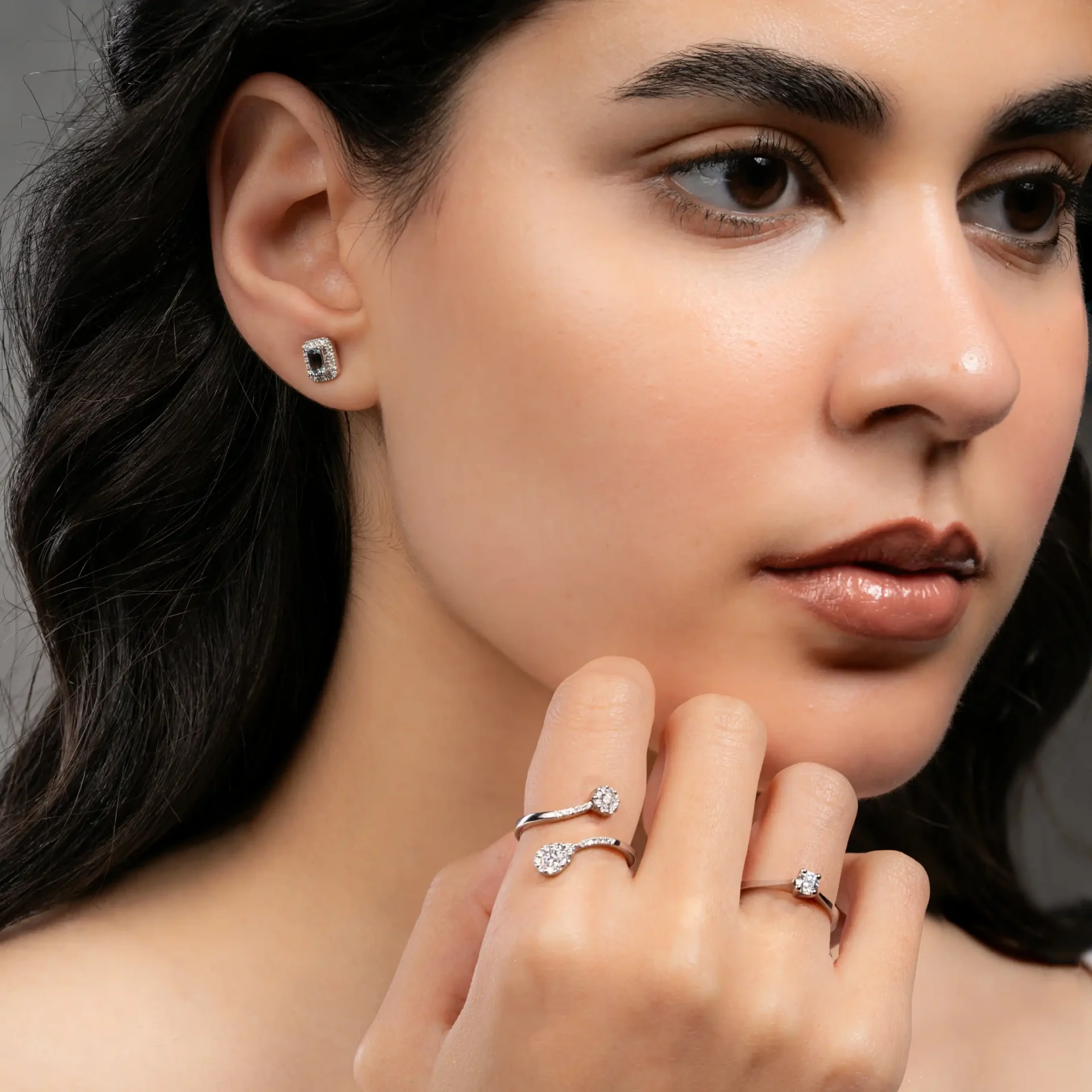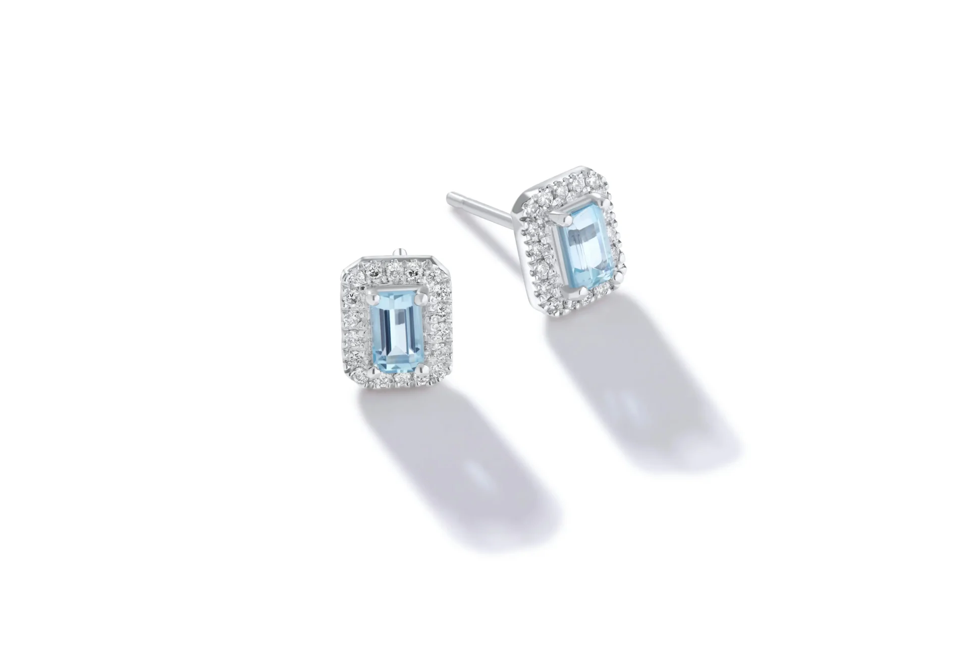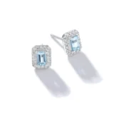 18K White gold earrings with central light blue aquamarine gemstone surrounded by diamond frame in baguette rectangular shape