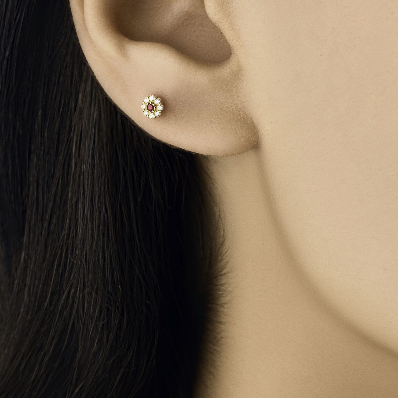 18K Yellow gold flat back piercing with diamond circle and central ruby gemstone (one piece)