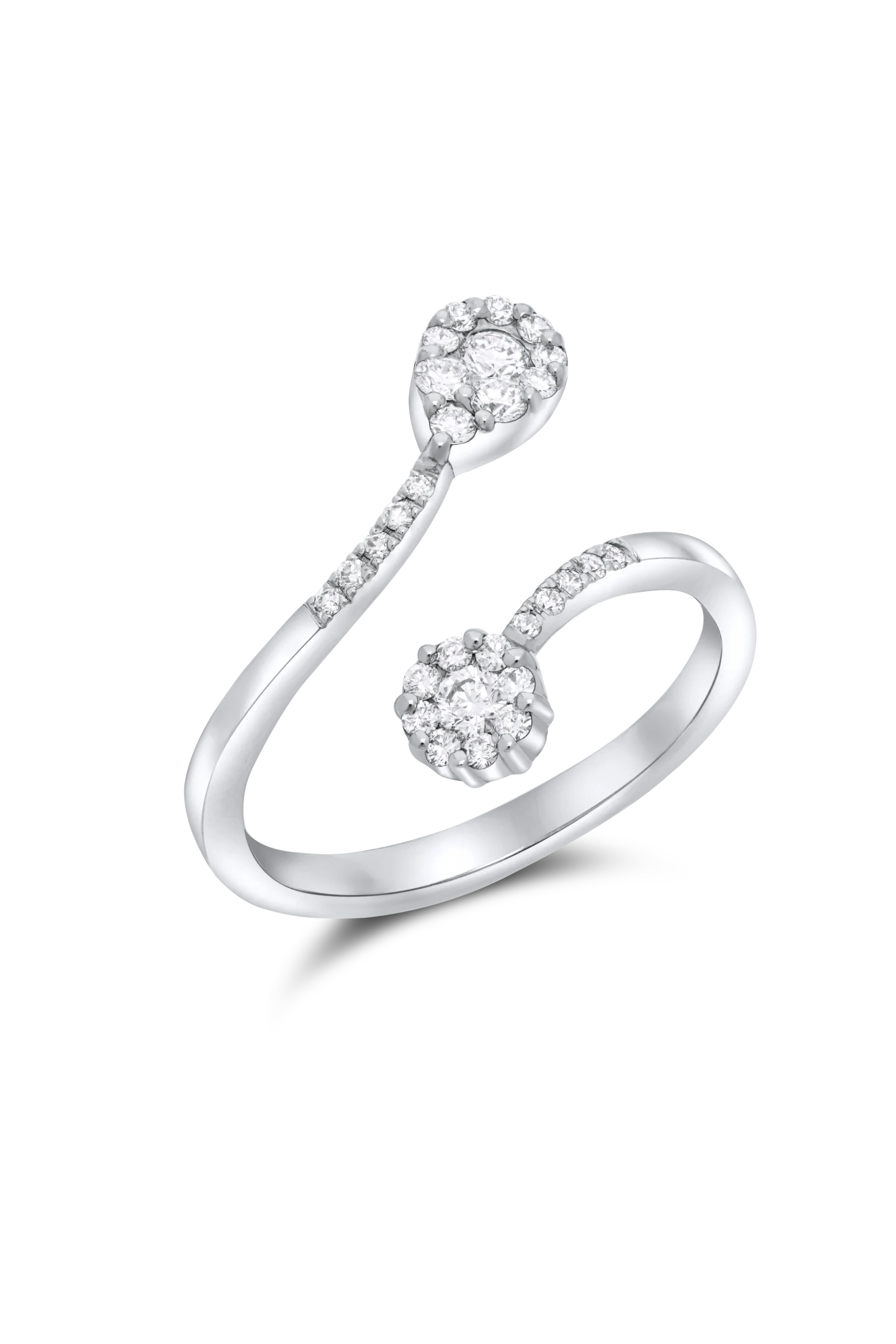 18K White gold open ring with round shaped and drop shaped diamond units and diamond band