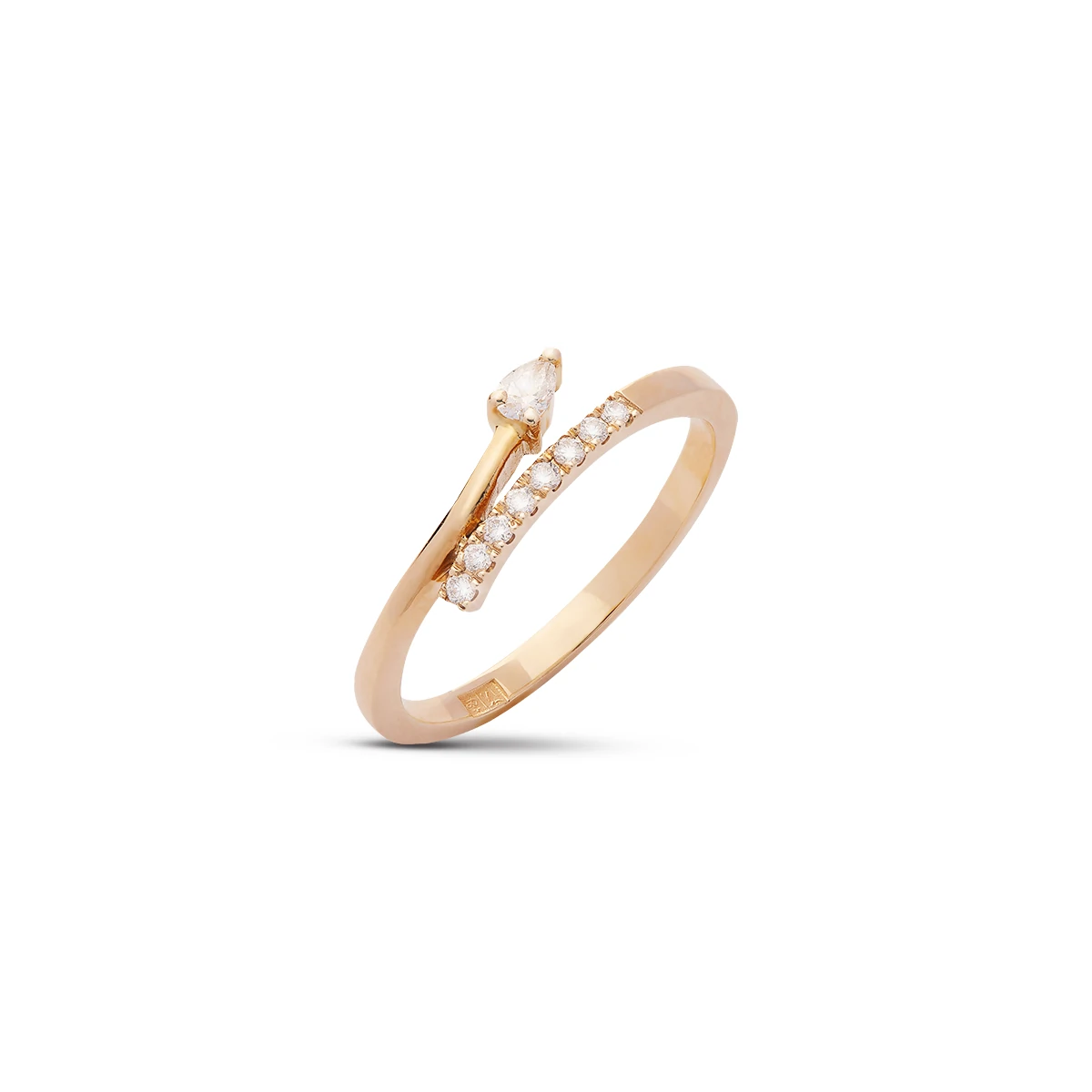 18K Yellow gold ring with single pear cut diamond supported by a diamond layer beneath in a snake style form