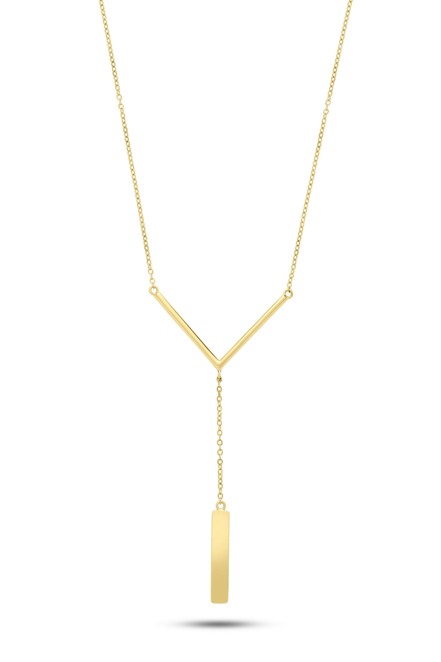 18K Yellow gold necklace with V shaped center and dangling gold bar charm