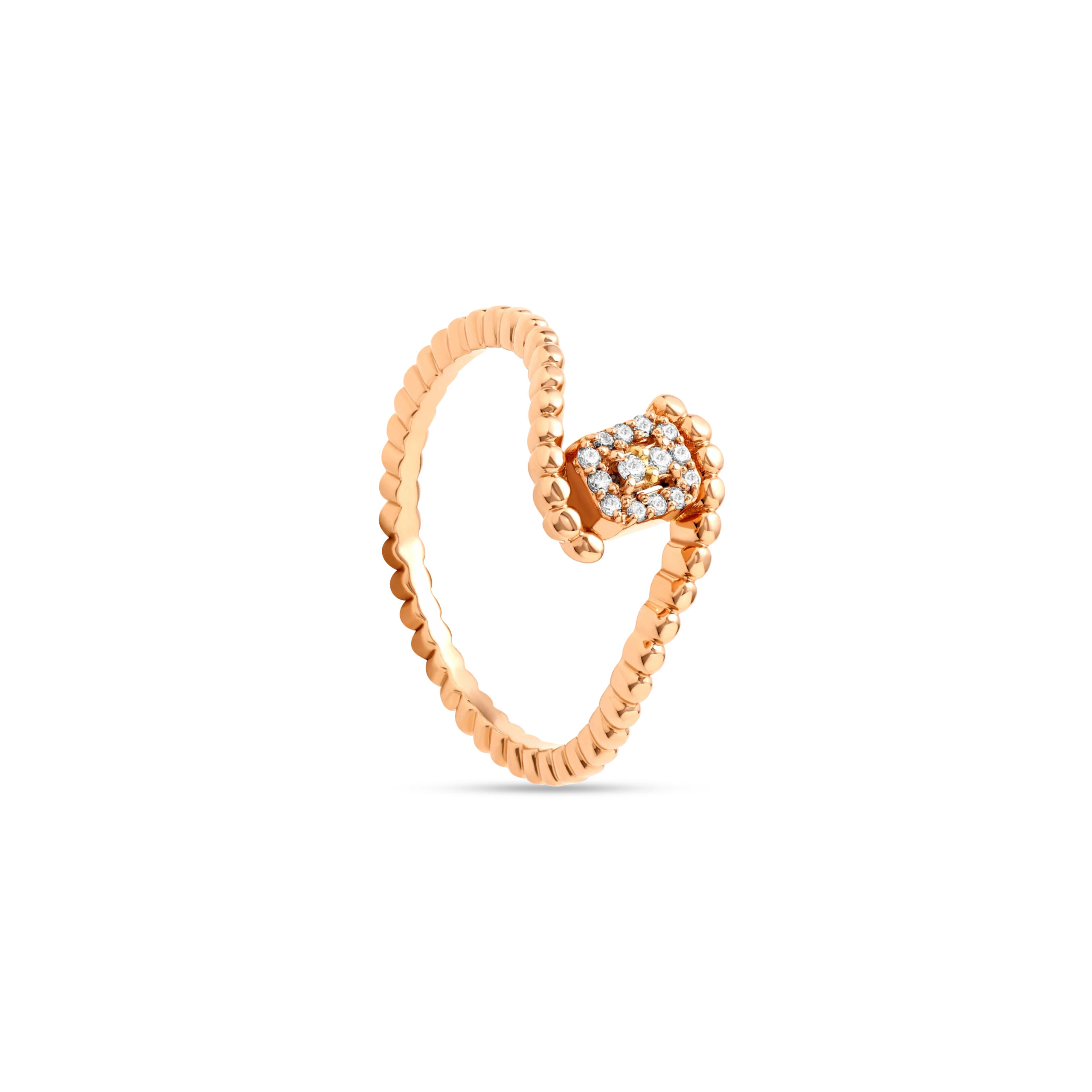 18K Rose gold ring with overlapping balls band and central baguette shaped diamond center