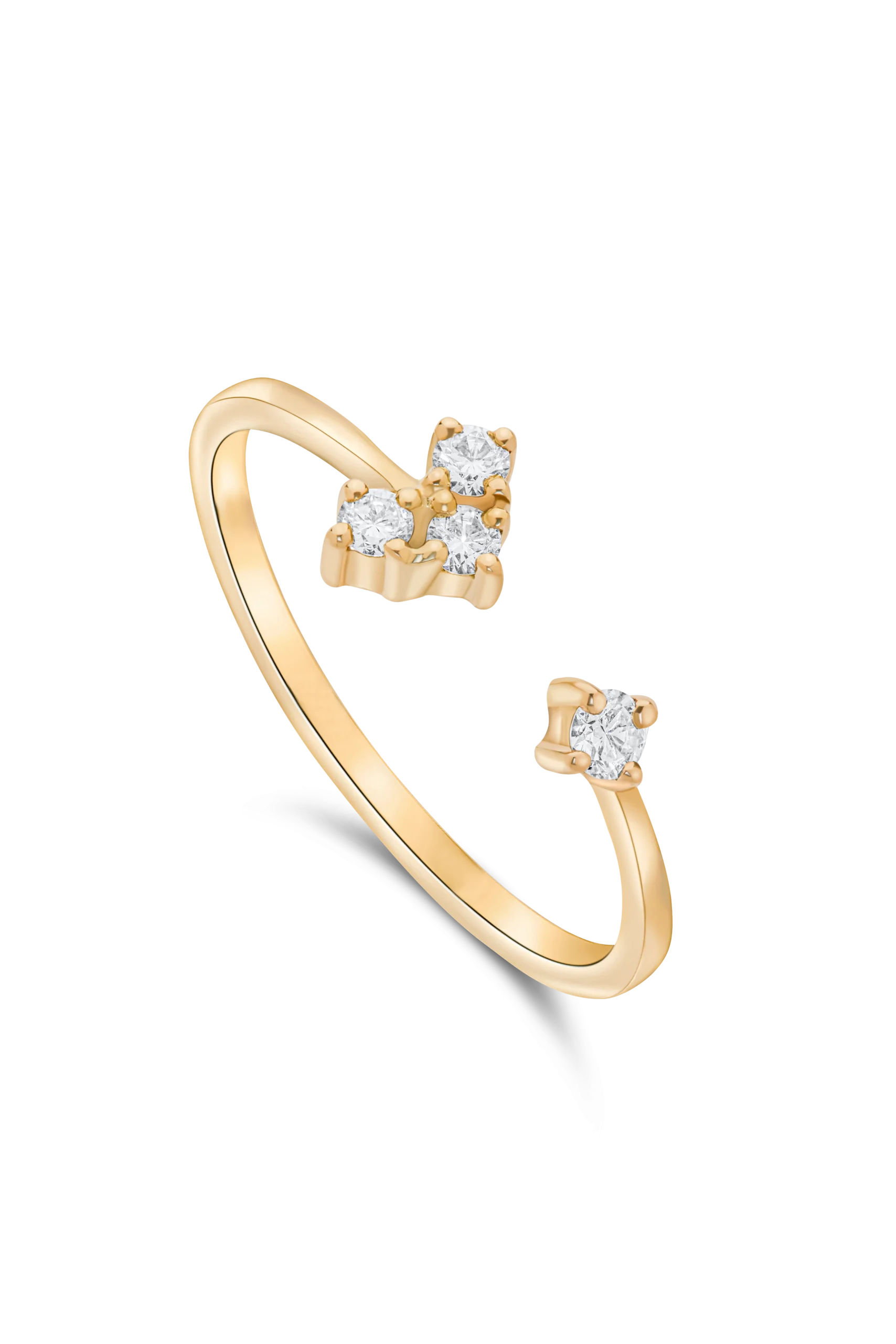 18K Yellow gold diamond open ring with one diamond facing 3 diamonds in triangle shape