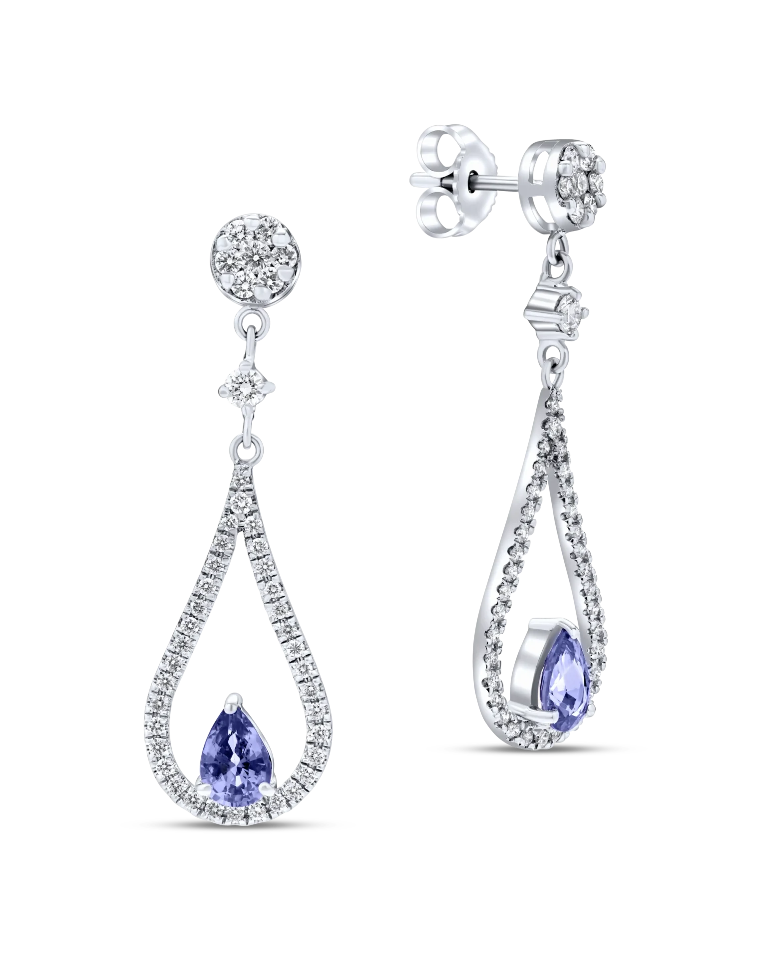 18K White gold dangling earrings of drop shape diamond units holding Ceylon blue sapphires in pear cut