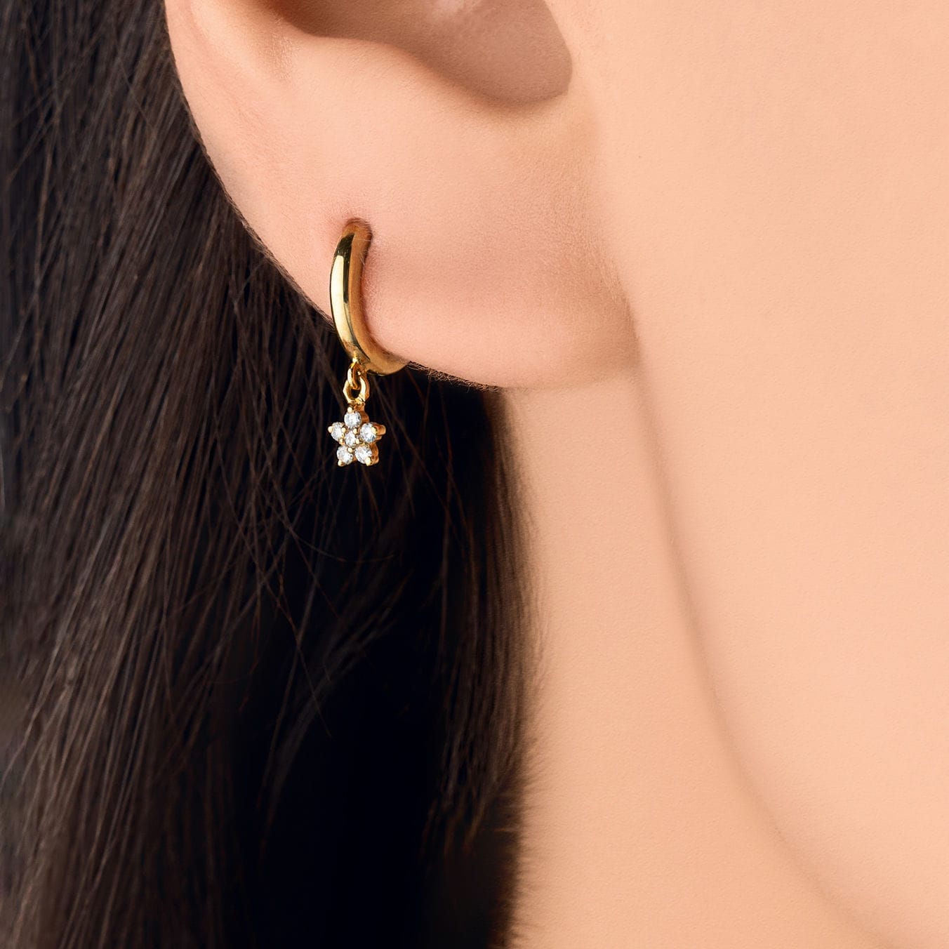 Small Gold Hoop with Dangling Diamond Flower – One Piece
