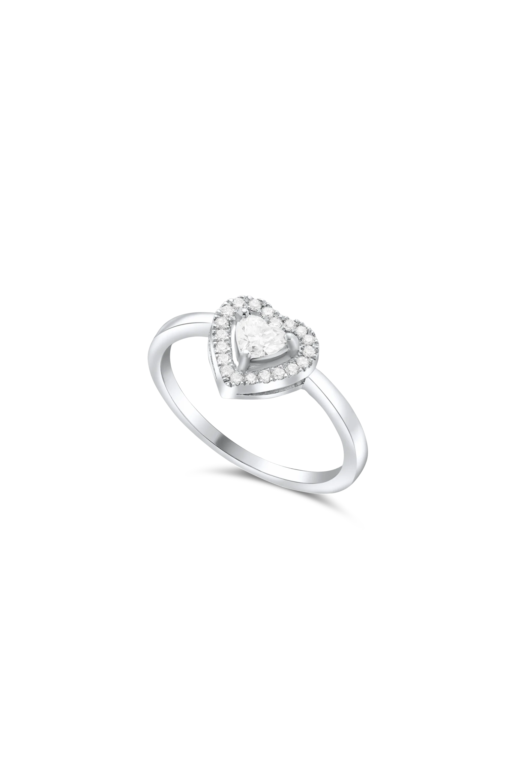 18K White gold solitaire ring of heart shaped diamond stone center and diamond frame