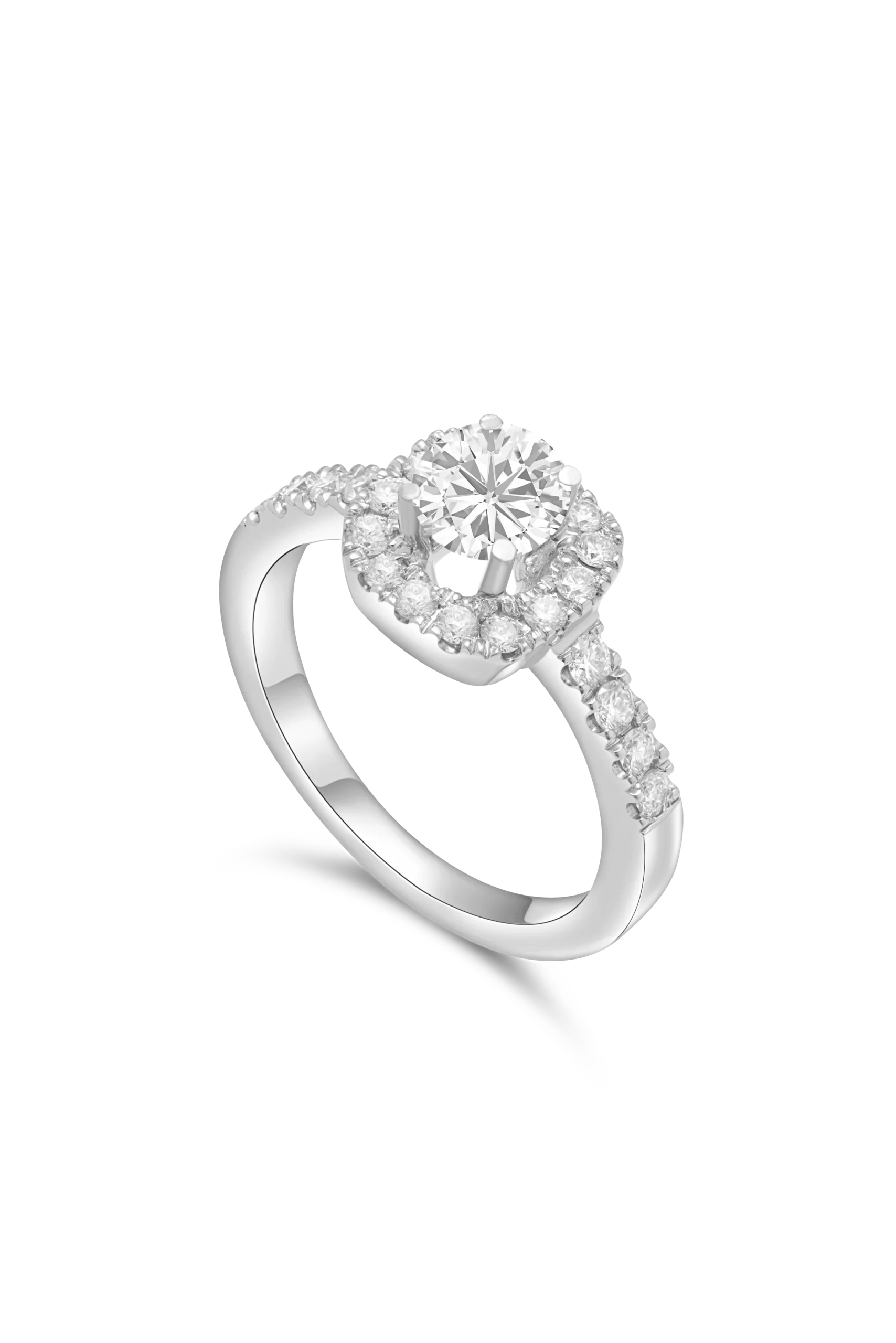 18K White gold solitaire ring with diamond rounded square frame and diamond band.