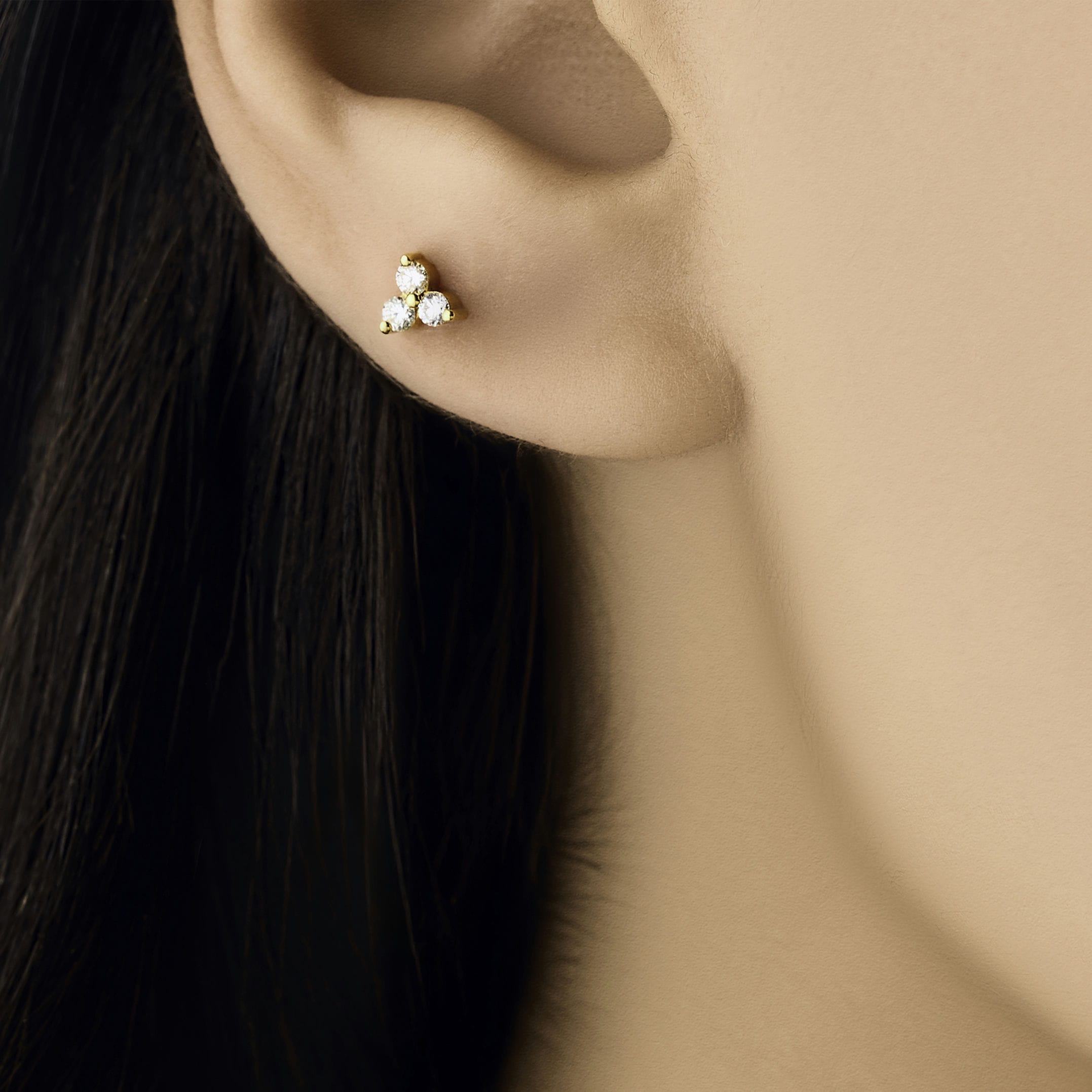 18K Yellow gold flat back piercing of three round diamonds forming a triangular shape (one piece)